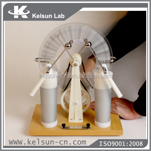 This premium electrostatic generator showcases meticulous engineering designed to produce consistent, powerful electrical discharges suitable for comprehensive physics demonstrations and laboratory experiments. The apparatus features twin rotating discs mounted on precision bearings, equipped with metallic sectors that accumulate and transfer electrical charge through carefully positioned collecting combs and neutralizing brushes. The entire assembly rests on a stable base structure that ensures safe operation while providing optimal viewing angles for classroom and laboratory environments.
