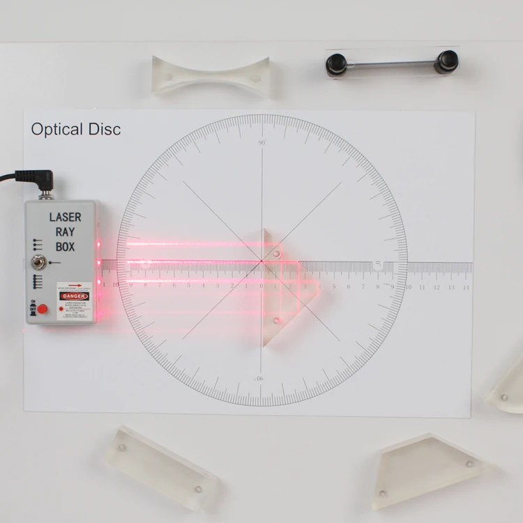 Students will explore refraction, and refection to understand how light commonly occurs and is commonly used in our daily lives. The kit comes complete with a Laser Ray Box that emits 1, 3, or 5 parallel beams and that is powered by an AC adapter, 8 optic components.mat with printed scales and angles, a laser light beam chart, and a foam-lined, impact-resistant.